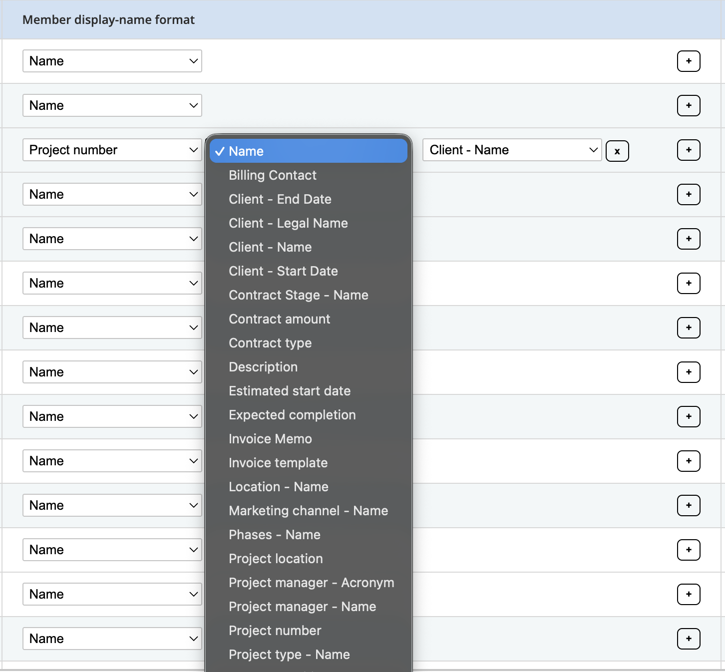 Administrators can now define how project and client names appear in the navigation panel (e.g., combining a project number with a short name). This helps maintain consistent naming conventions as your workspace grows.